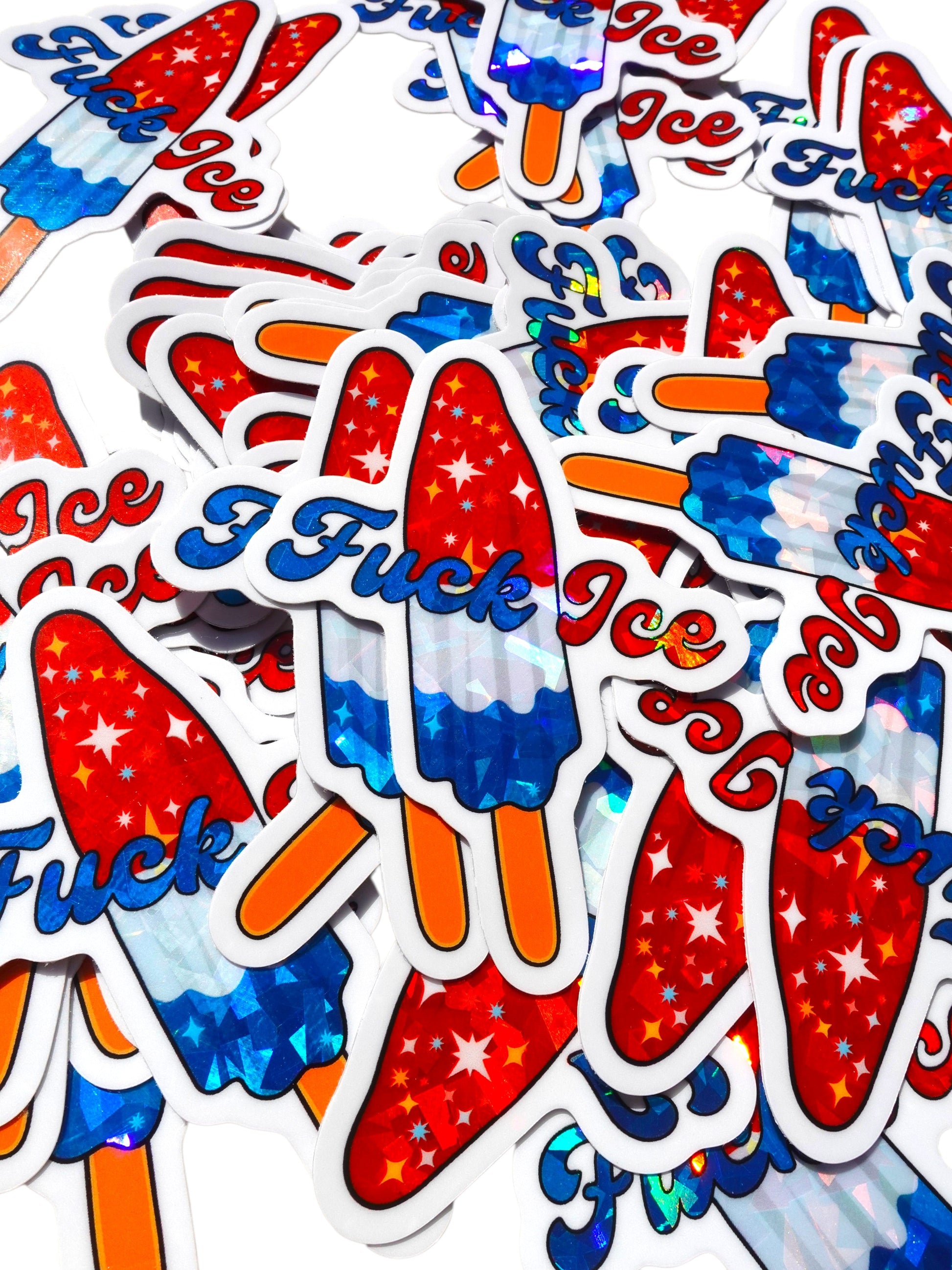 This holographic vinyl sticker takes the classic red, white, and blue rocket pop and flips it on its head with a bold message: Fuck Ice. Shiny, sassy, and unapologetically loud — this sticker is for anyone who loves retro summer vibes with a rebellious twist.