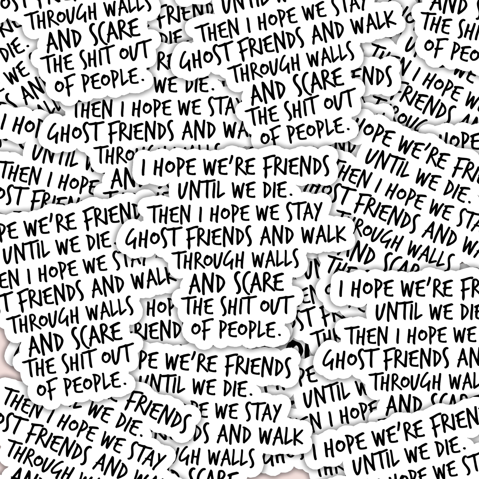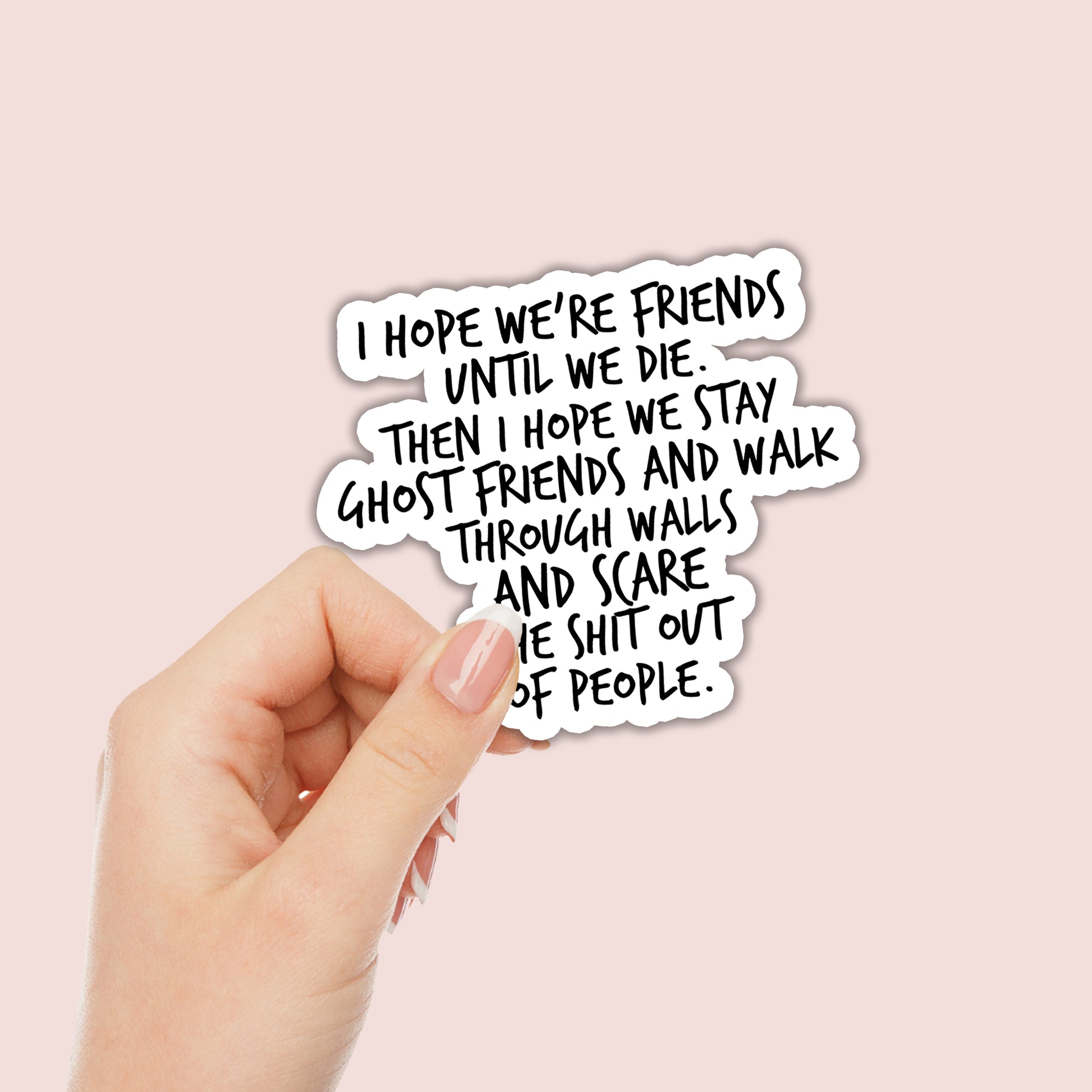 For the friend who’s stuck with you for life, the "I hope we’re friends until we die. Then I hope we stay ghost friends and walk through walls and scare the shit out of people" sticker is perfect. Whether you’re slapping it on your laptop, water bottle, or car, this humorous and spooky design celebrates a friendship that’s forever—even in the afterlife.