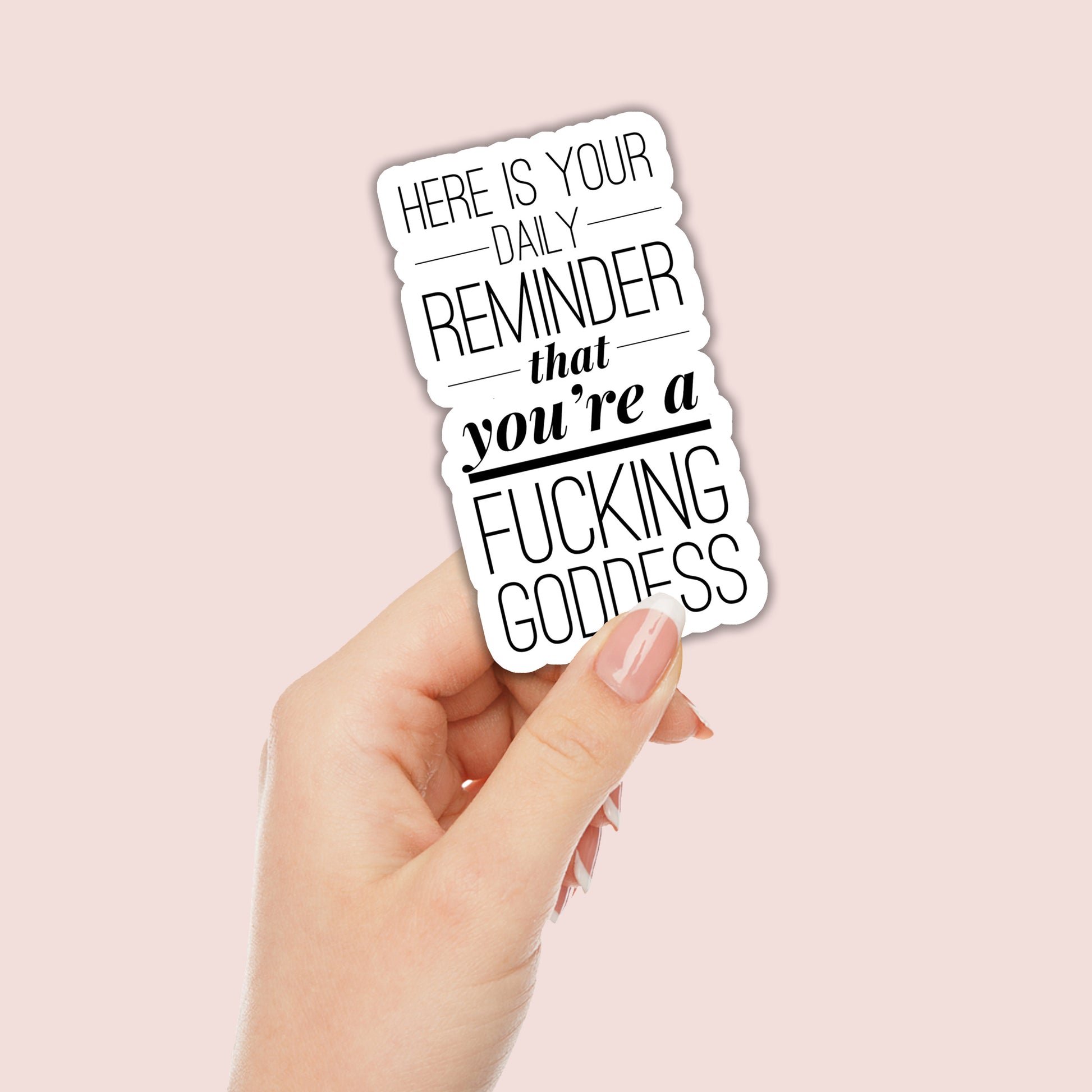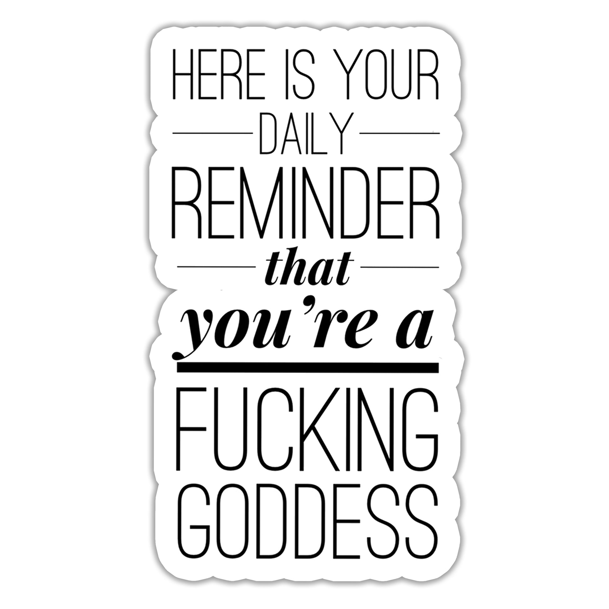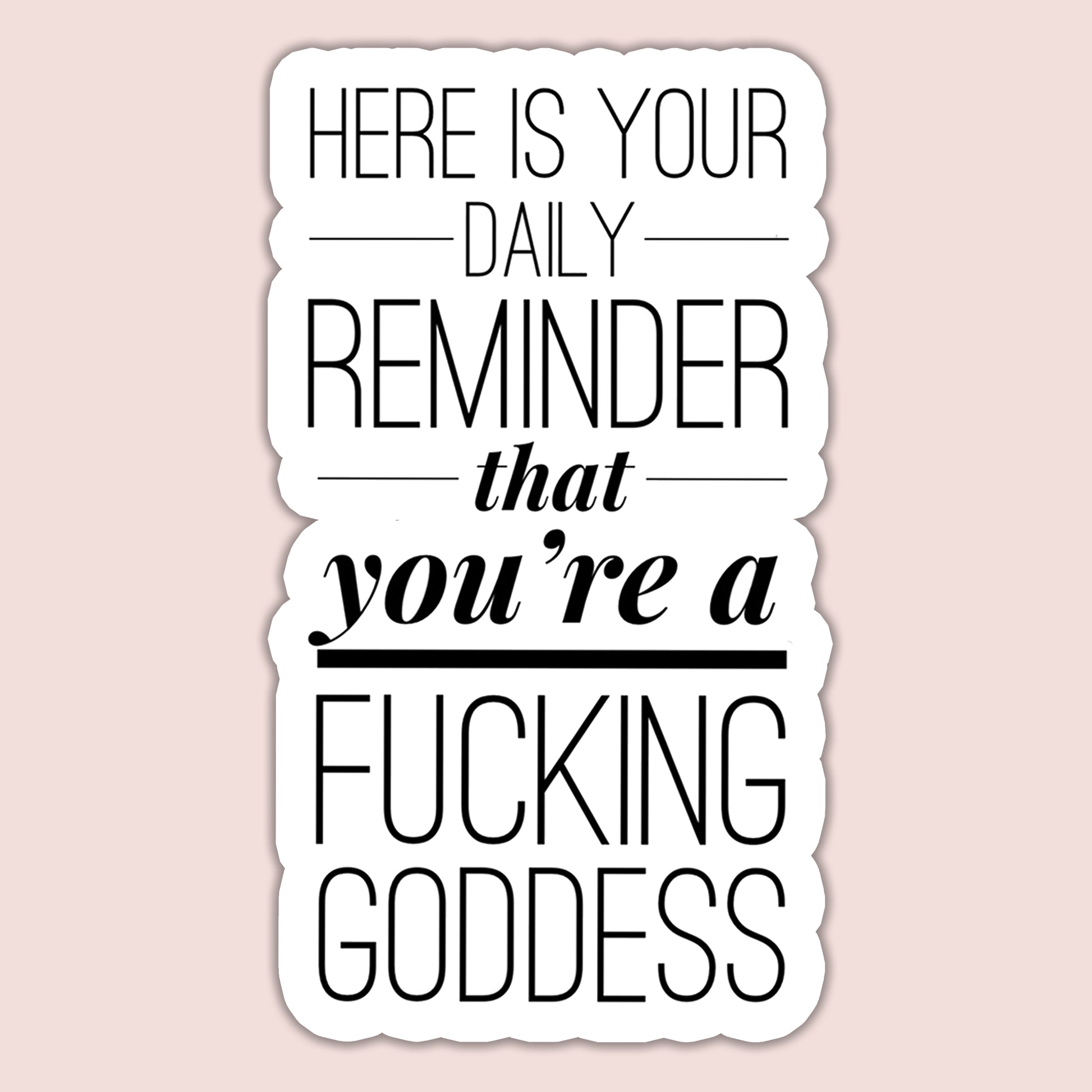 Need a daily dose of motivation with a side of sass? The "Here is your daily reminder that you are a fucking goddess" sticker has you covered. Perfect for slapping on your laptop, water bottle, or notebook, this sticker will remind you of your inner power everywhere you go. Get ready to feel unstoppable with this cheeky, empowering design!
