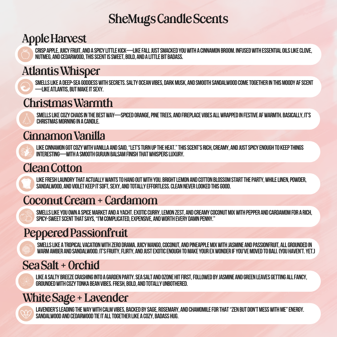 Crisp apple, juicy fruit, and a spicy little kick—like fall just smacked you with a cinnamon broom. Infused with essential oils like clove, nutmeg, and cedarwood, this scent is sweet, bold, and a little bit badass.
